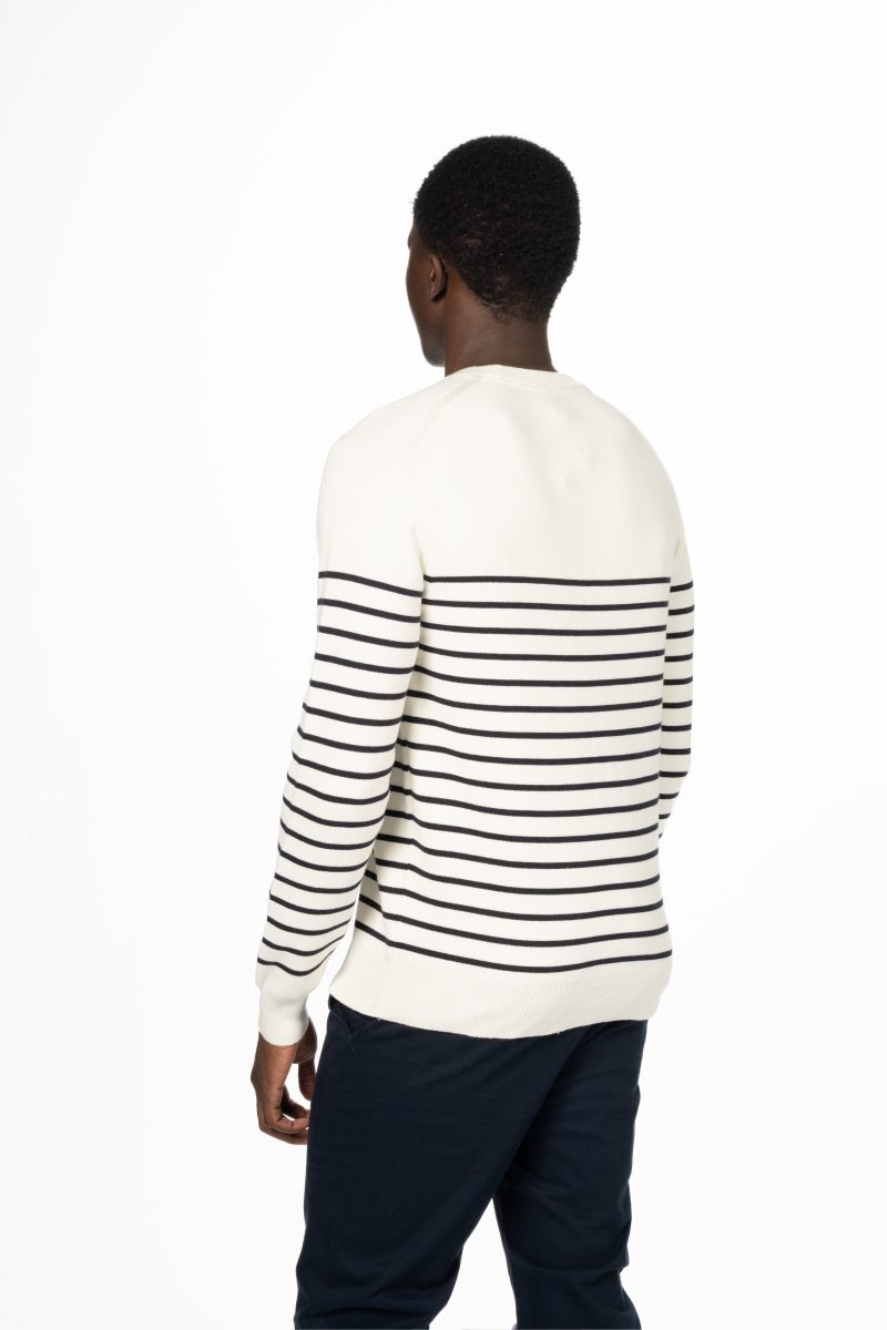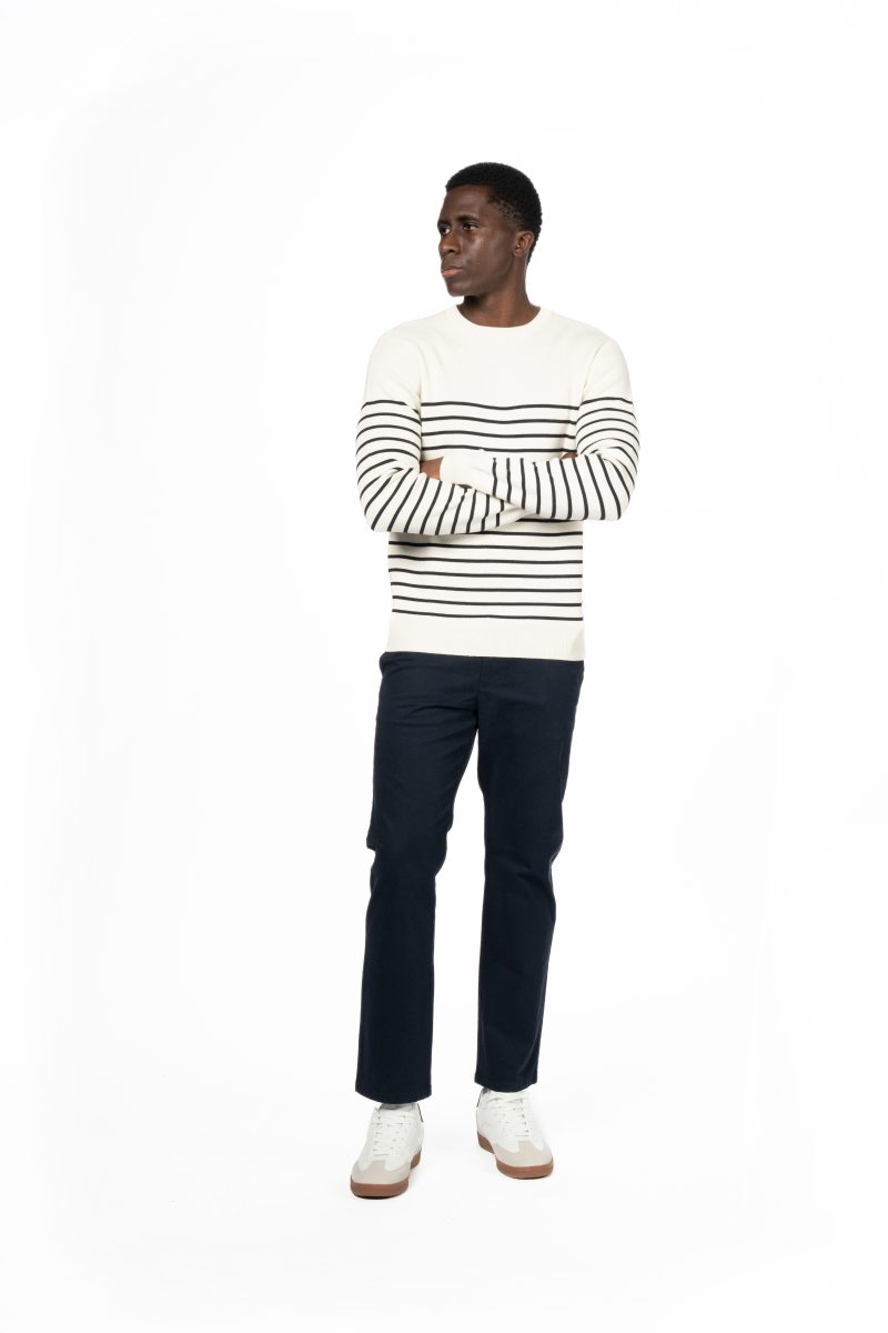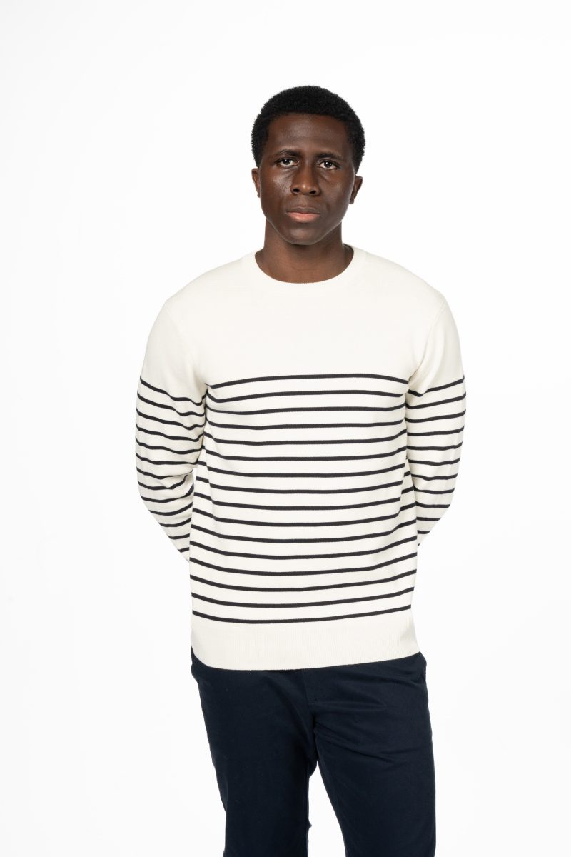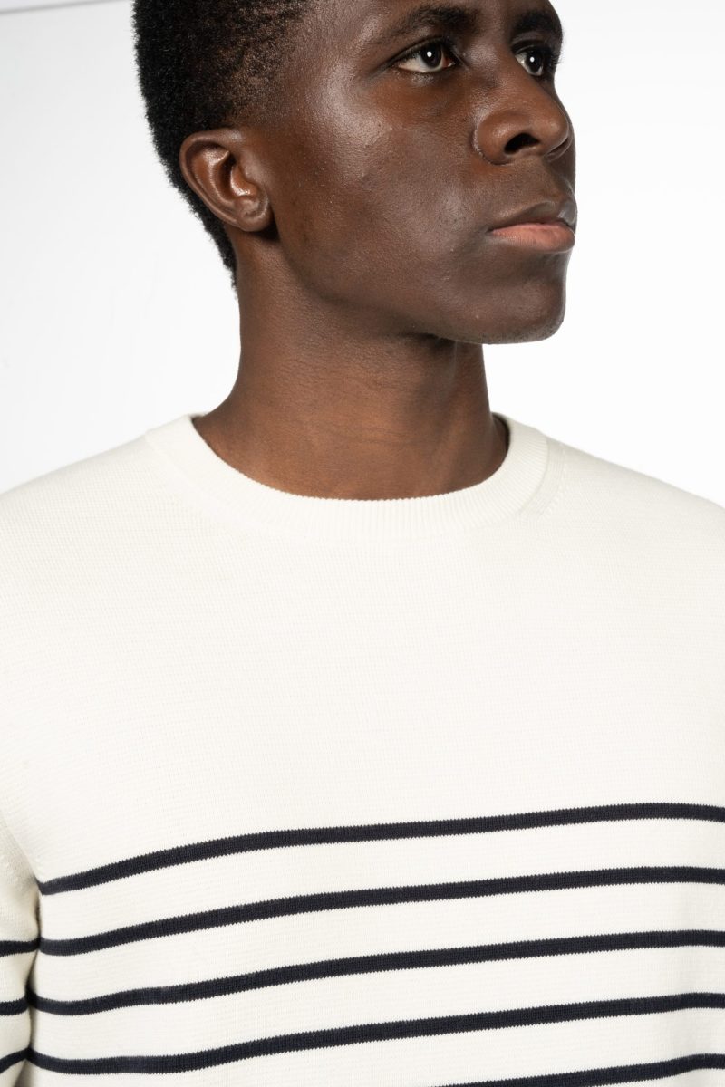 This crew neck jumper is crafted in a dense Milano stitch, giving it a clean finish with noticeable structure and weight. It holds its shape well, making it an elevated alternative to a casual sweatshirt. The Breton stripe adds timeless character, while the modern cut keeps it sharp and easy to wear.