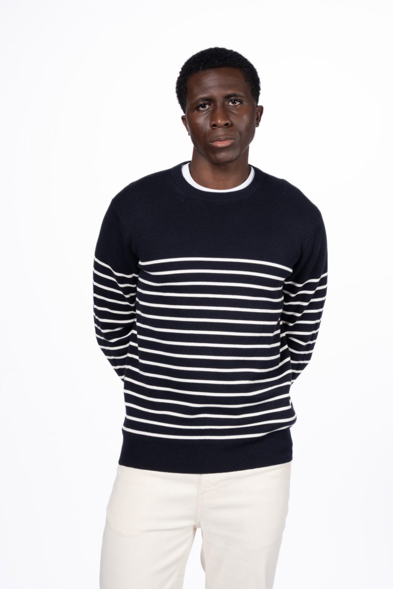 This crew neck jumper is crafted in a dense Milano stitch, giving it a clean finish with noticeable structure and weight. It holds its shape well, making it an elevated alternative to a casual sweatshirt. The Breton stripe adds timeless character, while the modern cut keeps it sharp and easy to wear.